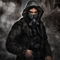 a gas mask and a respirator, indicating that he may be in an area with toxic air conditions. On his chest and around his waist, there are various