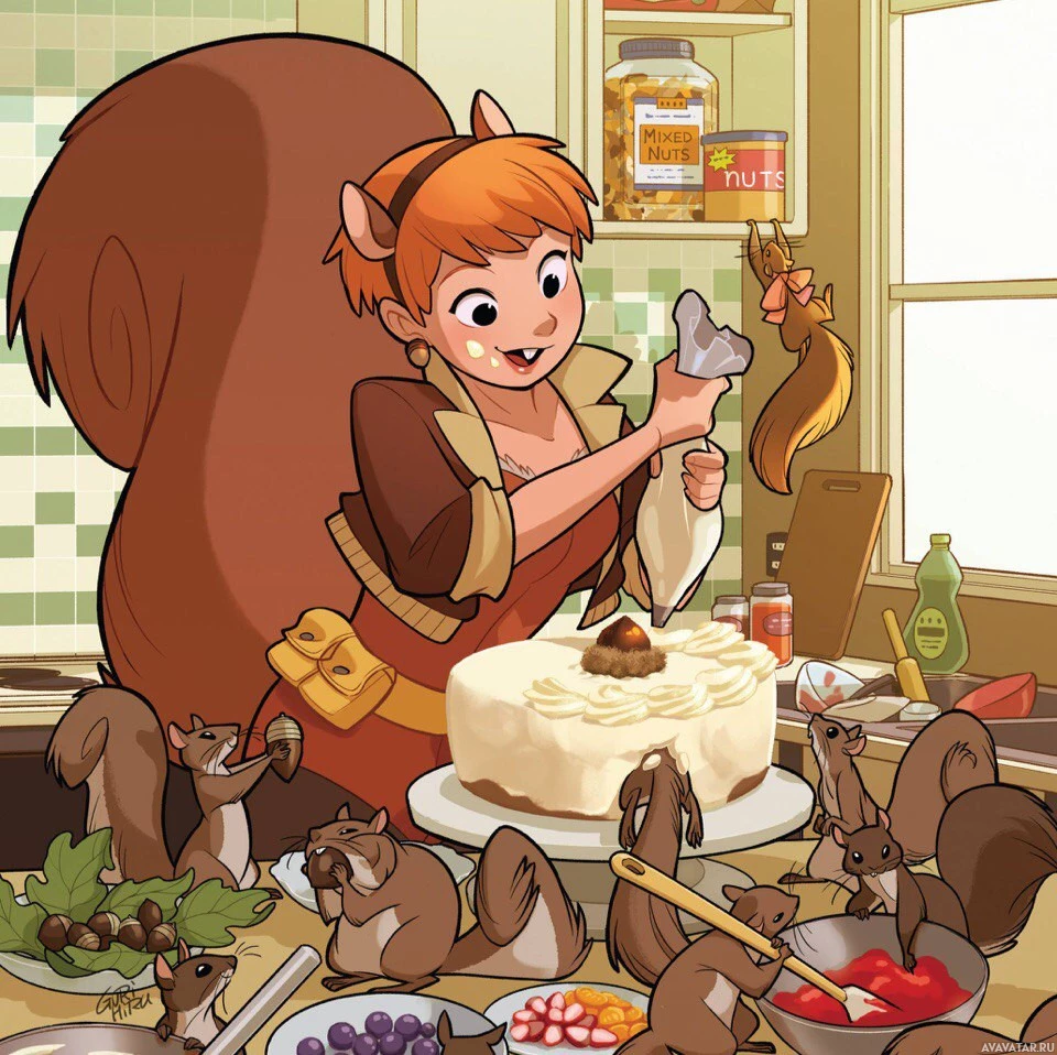 a kitchen counter, baking cakes with several other squirrels around her. There are multiple cakes on the counter, one of which has been decorated and possibly frosted. The environment suggests a cozy and whimsical setting, likely from