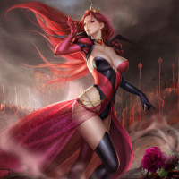 red hair, dressed in what appears to be an armored costume with red and black elements. She is standing on a battlefield or ruins, which are depicted with smoke and fire, suggesting