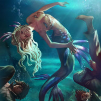 air bubbles suggesting she might be singing or speaking. There are two human males in the water below her; one is looking up at the mermaid with awe, while the other seems to be struggling, possibly indicating he's been caught by the mermaid and is being held captive. The artwork style suggests it could be from