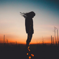 orange lights scattered around the person's feet, which may suggest an artistic element added to the photo or could represent fireflies. The overall mood of the image is contemplative and serene, capturing