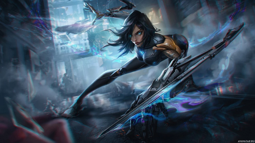 a female character with brunette hair, set in a science fiction context. She is shown in an action pose with one arm extended forward and the other resting on her hip. Her expression appears to be intense or focused. In the background, there are dynamic elements such as