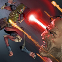 a skeleton costume and is holding what appears to be a weapon with a red beam, while the other character is on the ground looking up at his attacker. Both characters are depicted with