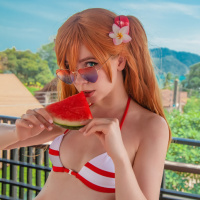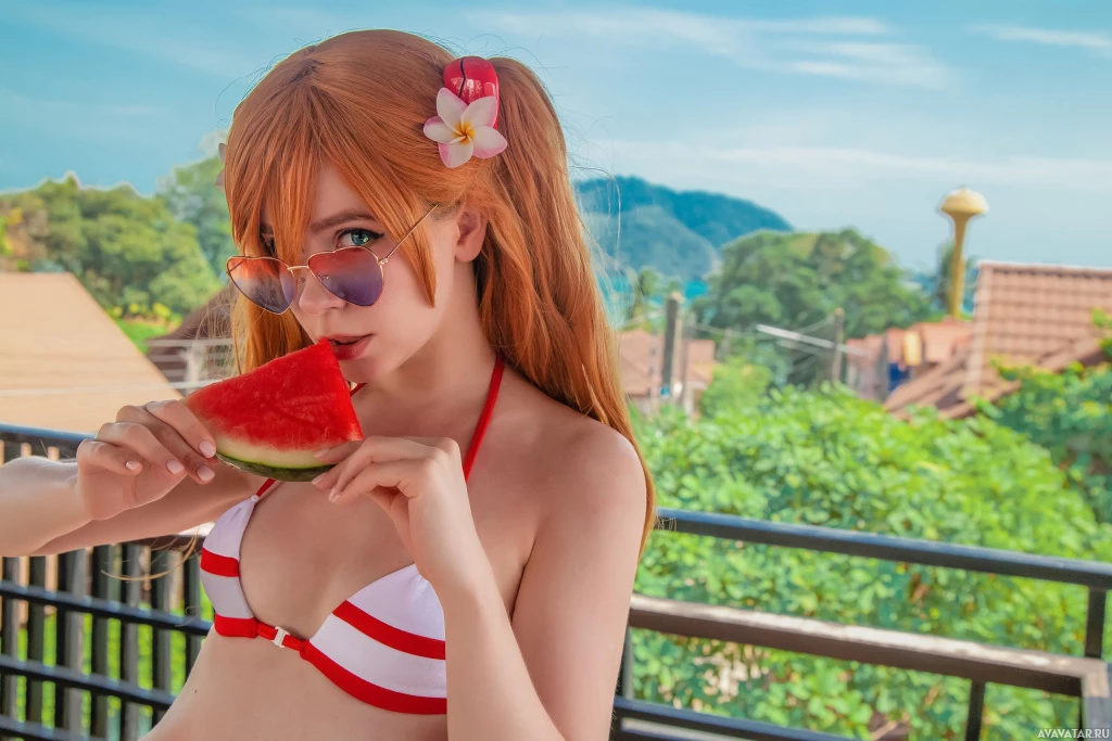 long hair and is wearing a white bikini with red stripes, reminiscent of the character Asuka Langley from the "Neon Genesis Evangelion" series. In her hand, she holds