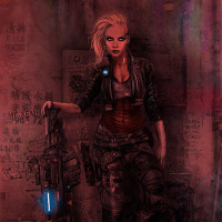 a robotic arm and is holding a weapon that resembles a futuristic rifle or gun. Her expression is serious and focused. In the background, there are what appear to be