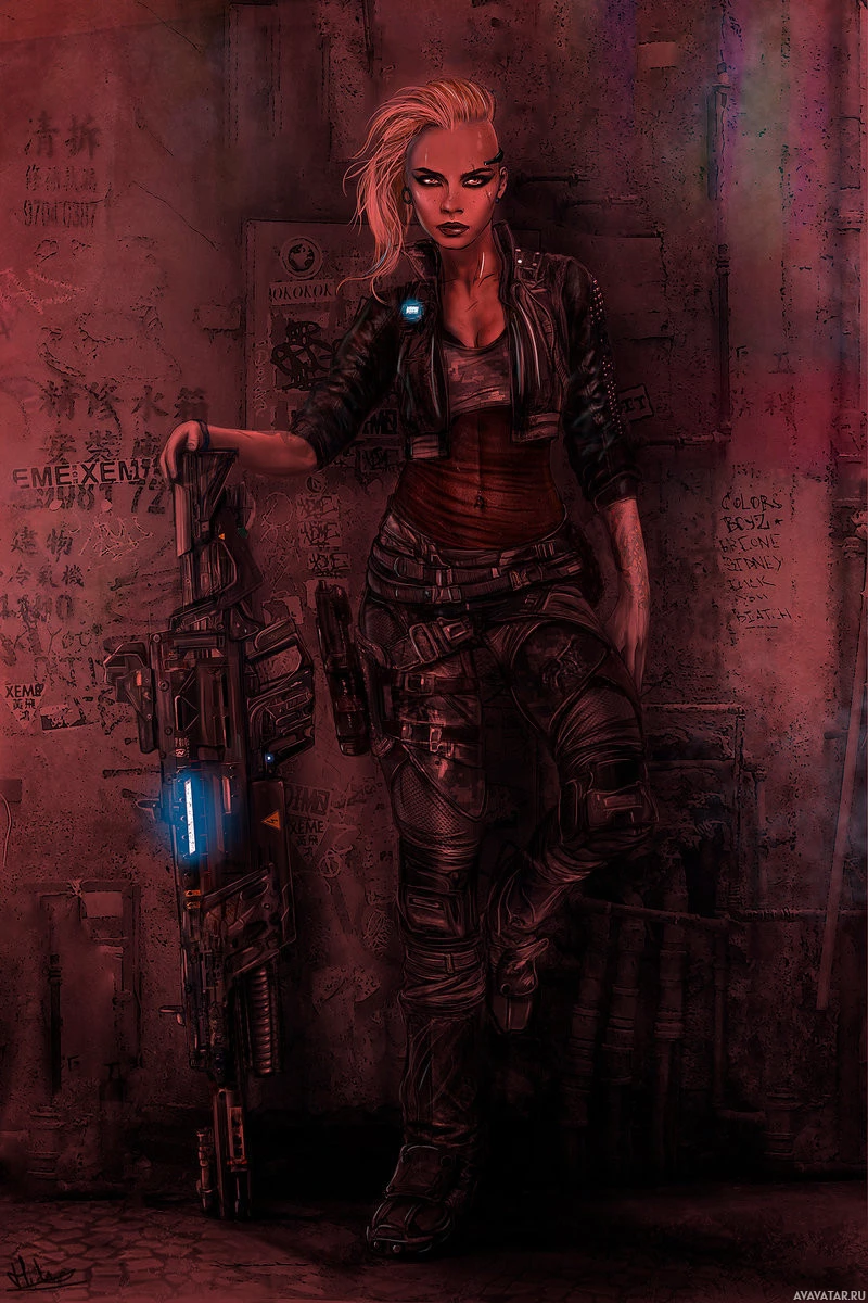 blonde hair and is dressed in a futuristic military outfit. She has