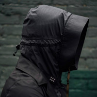 hooded jacket, which has the Adidas logo on it. The individual is standing in front of