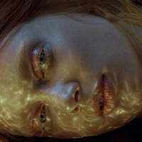 The image features a woman lying down with her face partially submerged in what appears to be water. She has