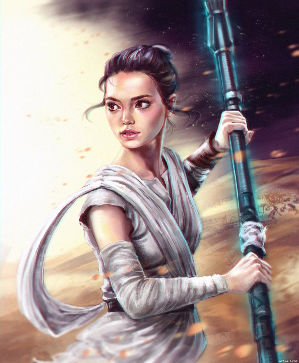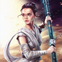 the Star Wars franchise named Rey. She is depicted holding what appears to be a lightsaber, which is a weapon used by the Jedi Order in the Star