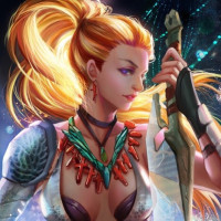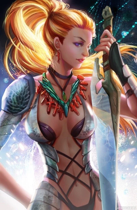 a dynamic pose, holding what appears to be magical staffs or weapons, suggesting she may have some sort of magical or heroic role. She's wearing armor that has a futuristic or fantasy element to it, and the background features stylized effects that give off
