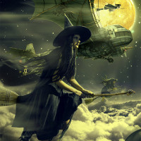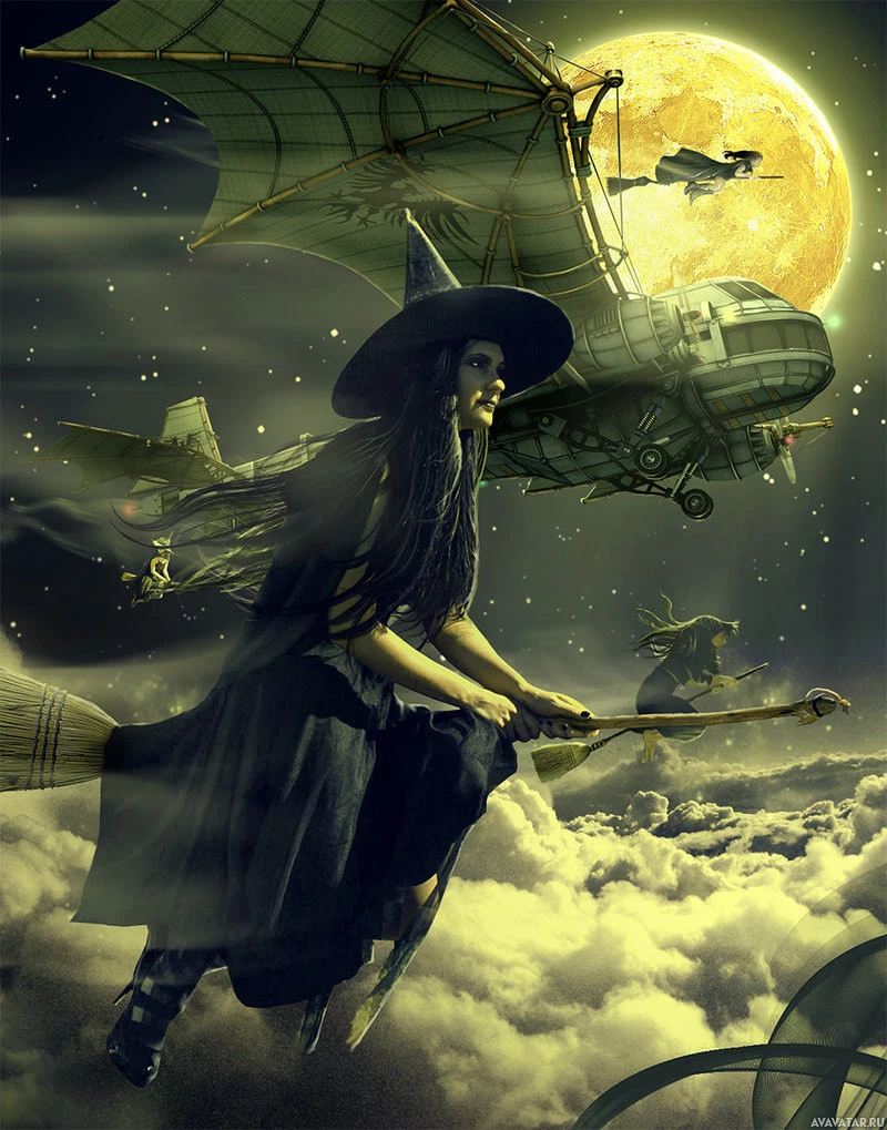 a full moon, which contributes to the mystical atmosphere of the scene. The witch appears to be flying through clouds that partially obscure the view of the airplanes behind her.
