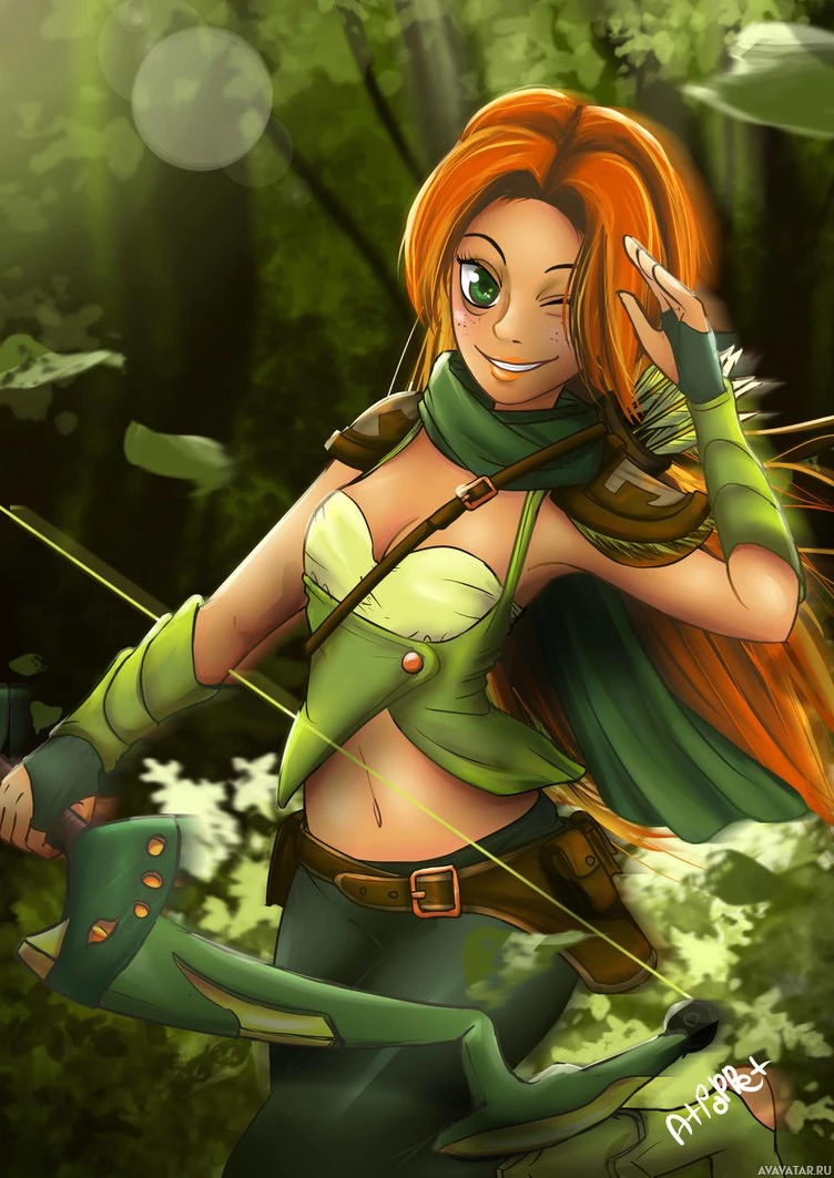 a female character from the game Dota 2, specifically known as Windranger. She is depicted with