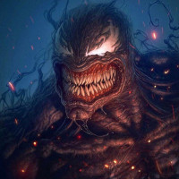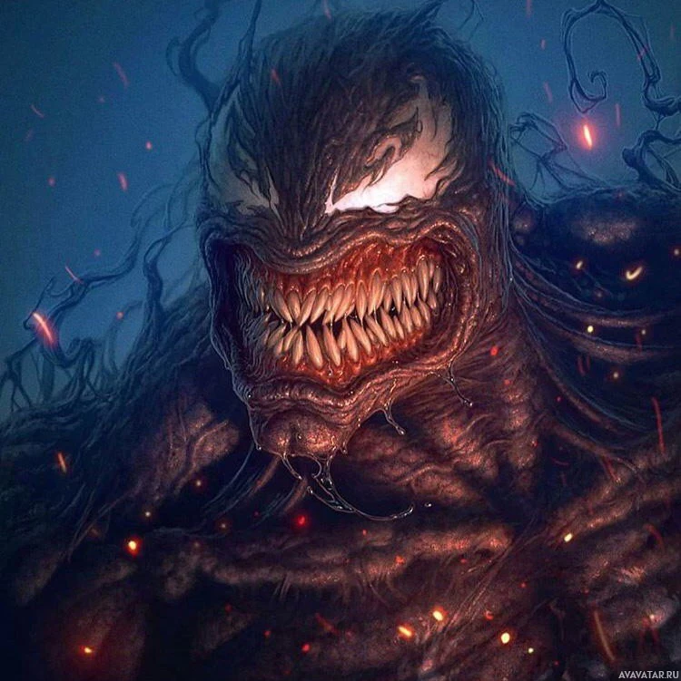 The image features a character known as Venom, who is depicted with a monstrous and menacing appearance. The character has a muscular build,