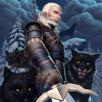 a stern expression and is holding a sword and a crossbow. He is wearing armor that suggests he is a witcher, which is the title of his