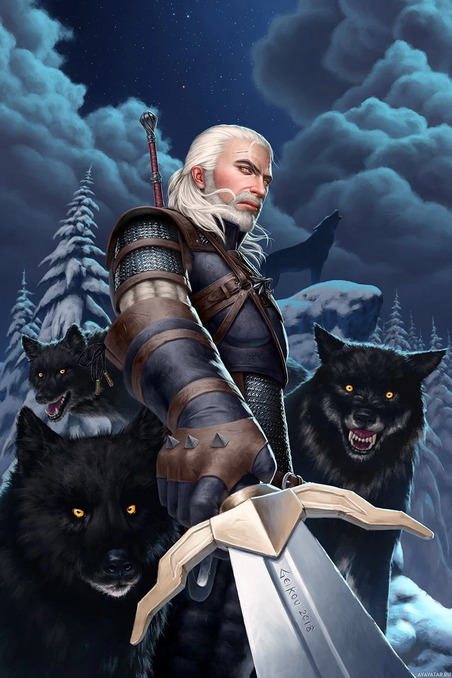 the video game "The Witcher 3: Wild Hunt." He is standing in front of two wolves. Geralt is portrayed with