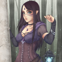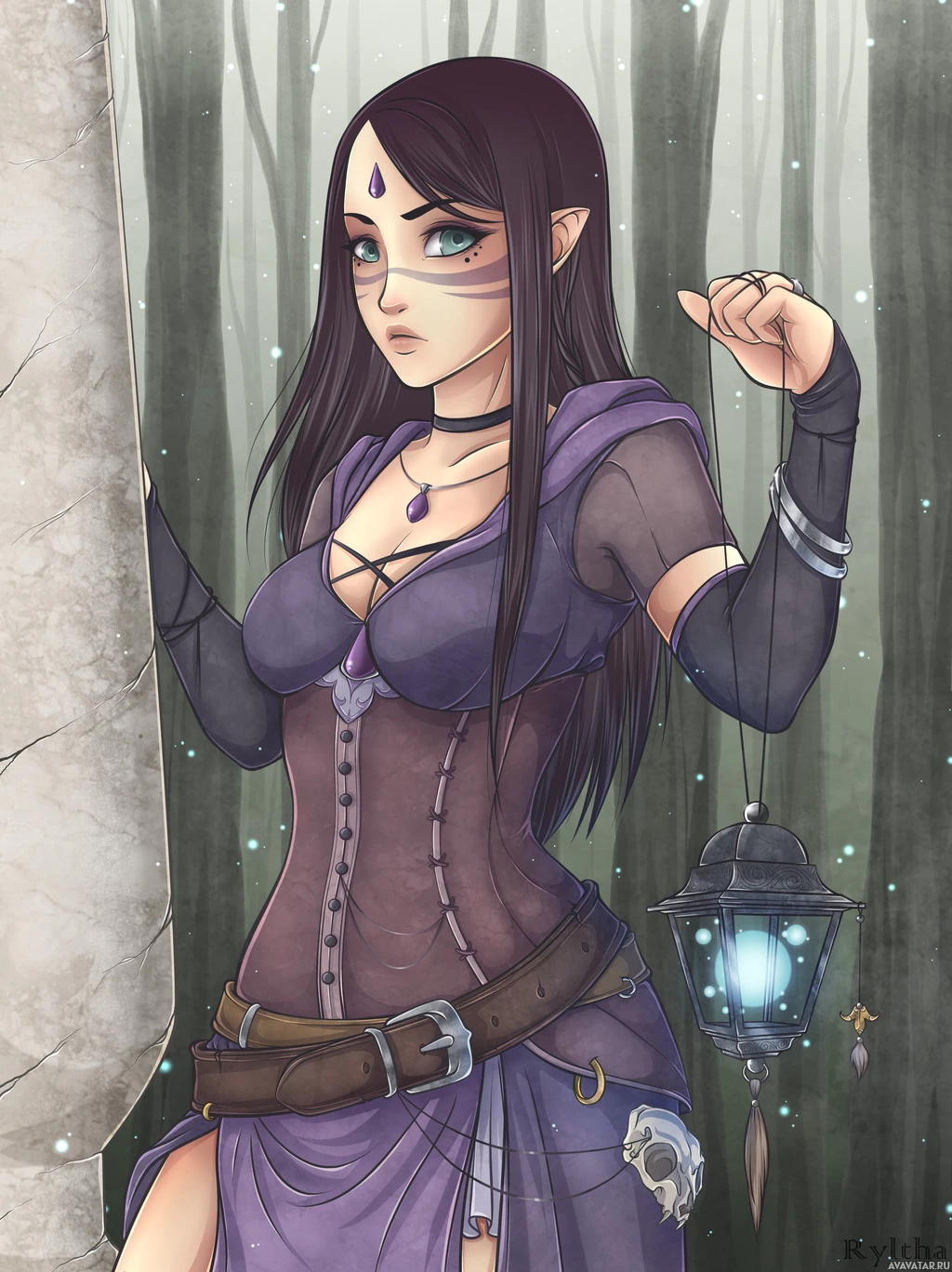 dark hair with a purple streak in it, and her makeup includes striking blue eyeshadow. In her right hand, she holds a lantern, which adds to the mystical or enchanted atmosphere of the scene. The background is a forest setting at nighttime, with trees silhouetted against