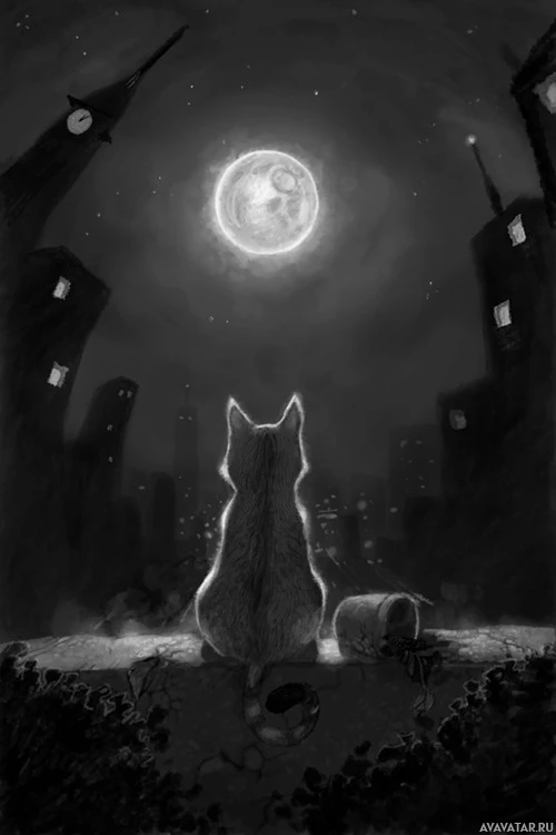 The image depicts a cat sitting on what appears to be the edge of a building or structure at night, looking up at