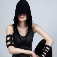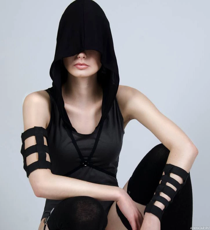 a hooded garment with a black fabric that obscures the face, leaving only the eyes visible. They are holding what appears to be straps or cords around their wrists. The person is sitting and has one leg extended in front of them. There are also textured bands or straps on the person's arms and legs, which could be part of a costume or