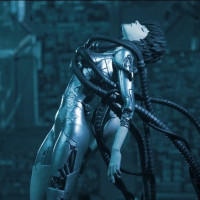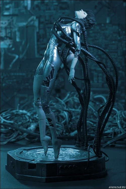 a humanoid figure, which appears to be a blend of organic and mechanical elements. It is set against an industrial or cyberpunk-inspired background with