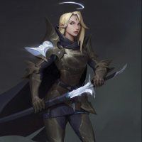 full armor with elements that appear to be inspired by fantasy or medieval themes, including a helmet with what seems like feathered plumes and a mask or faceplate covering her eyes. The armor has intricate details such as spikes and