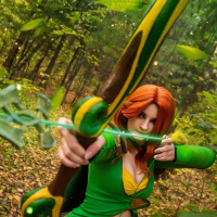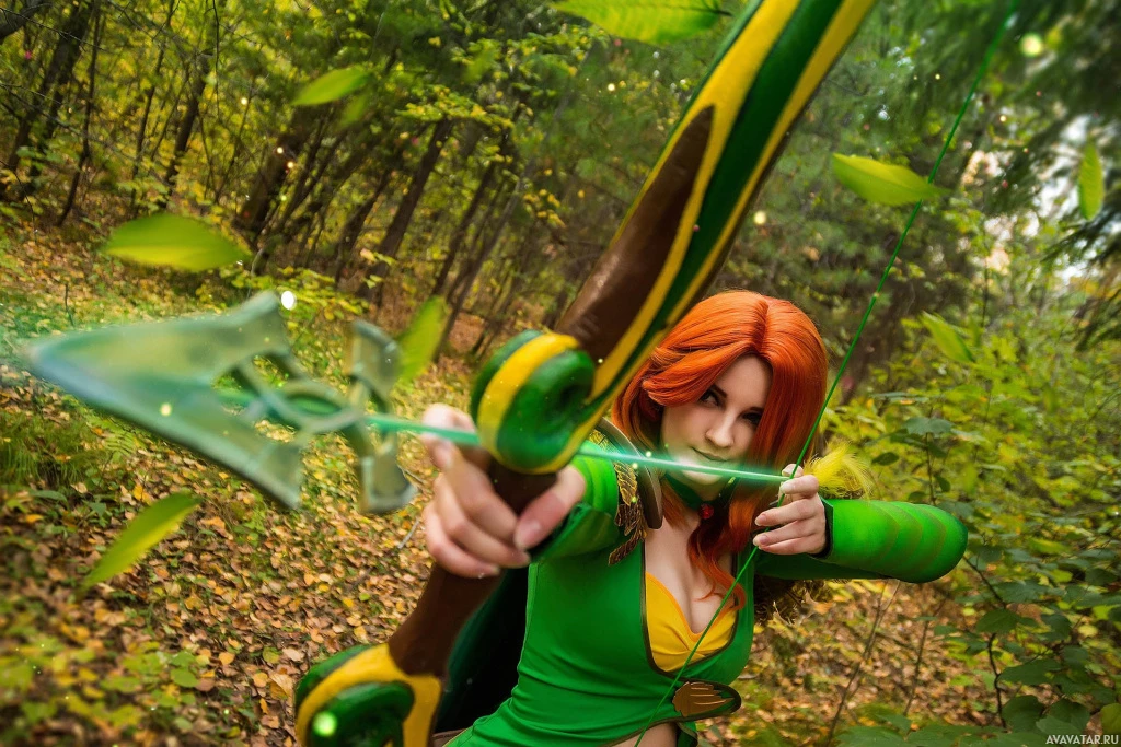 the video game Dota 2. She is wearing a green and yellow costume that resembles the character's outfit in the game, complete with a bow and arrow. The setting appears to be