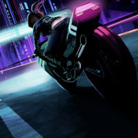 The image shows a person riding a motorcycle, from behind. The motorcycle appears to be futuristic or stylized with a design that suggests it may be a part of the "Ghost in the Shell" series, known for its cyberpunk themes and high-