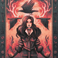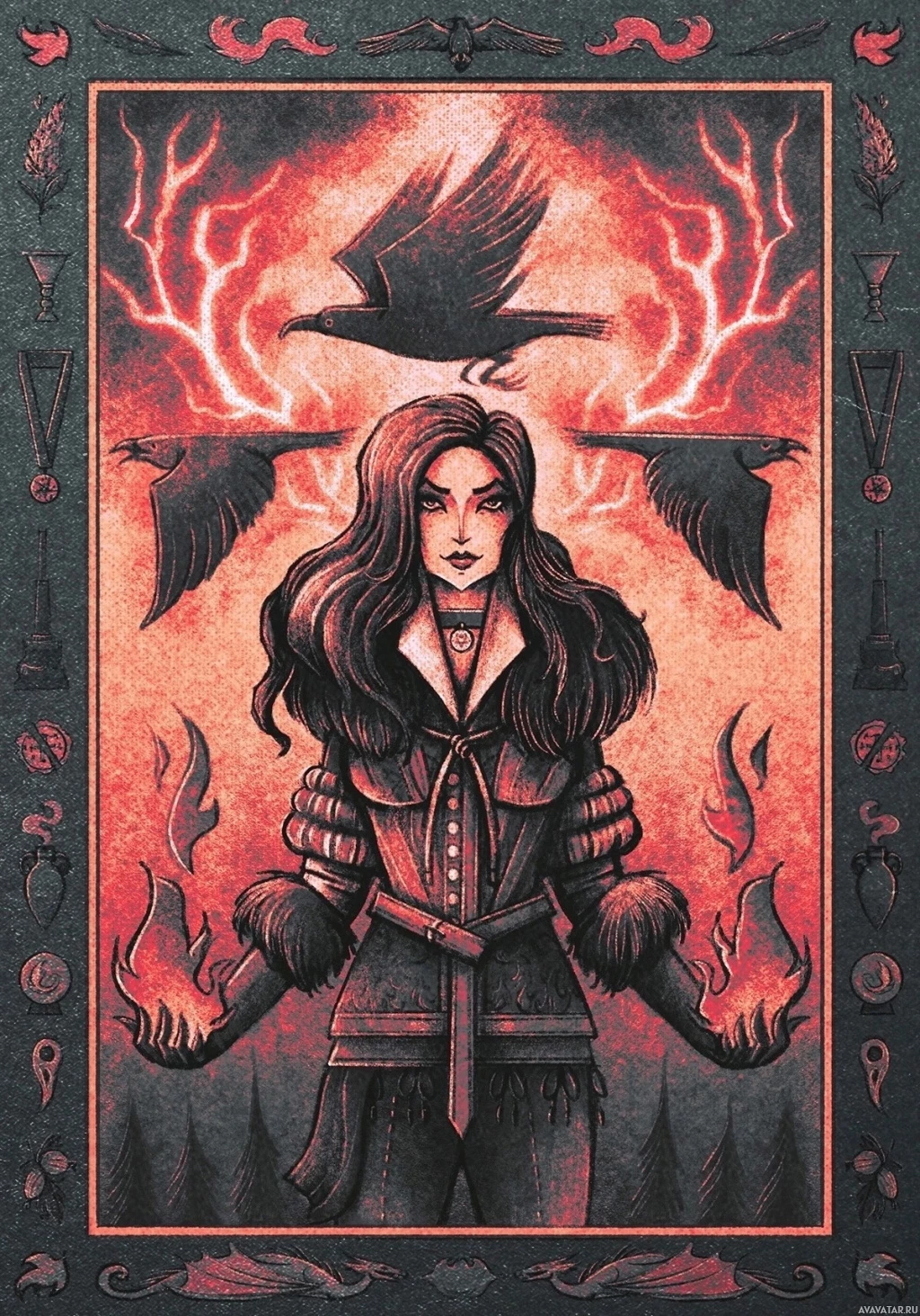 long hair and is wearing armor, holding a staff in her right hand. Above her head are two crows, and there are flames around her, suggesting she may be using magic or power that involves fire. In the background, there are silhouettes of trees and what appears to be