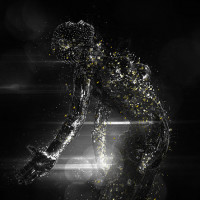a blend of organic and inorganic elements, with the figure appearing to be in motion, possibly as if it were skiing or performing some dynamic activity. The background is dark, which contrasts with the bright, glowing elements of the figure, adding