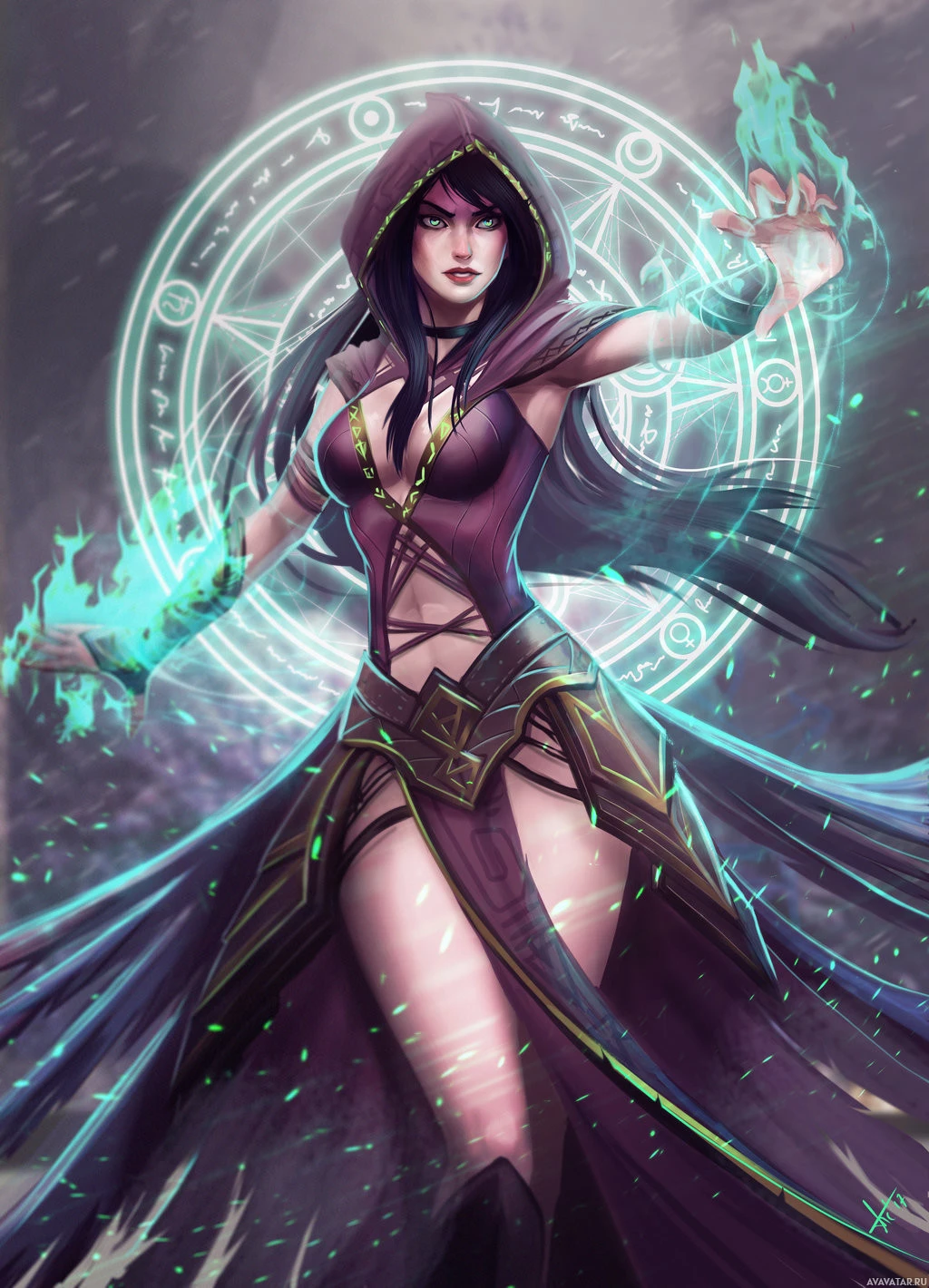 dark hair, is wearing a hooded cloak with intricate designs on it, and is casting a blue magical spell that appears to be emanating from her hands. The background includes a mystical-