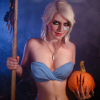 The image shows a woman dressed in a costume that resembles Ciri, a character from the video game "The Witcher." She is posing for Halloween with a festive theme. The text "Happy Halloween" and a pumpkin are visible in the image as well.