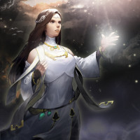 long hair and is wearing what appears to be magical robes, possibly indicating a mystical or supernatural role. Her hand is outstretched, and there's