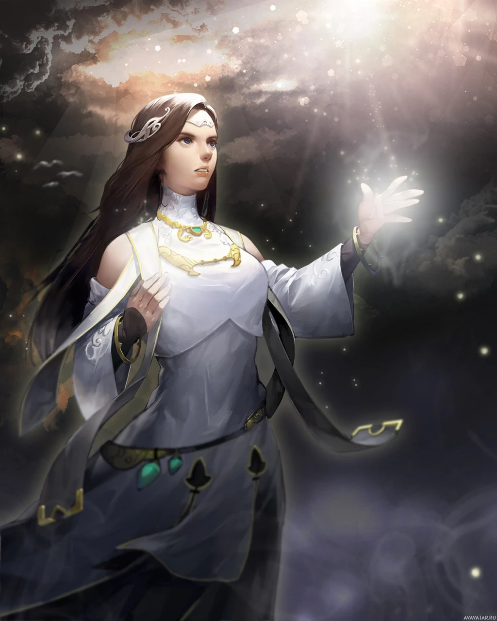 a glowing light emanating from it, which might indicate that she is casting a spell or performing magic. The background features dramatic clouds and lightning bolts, adding to