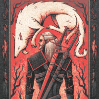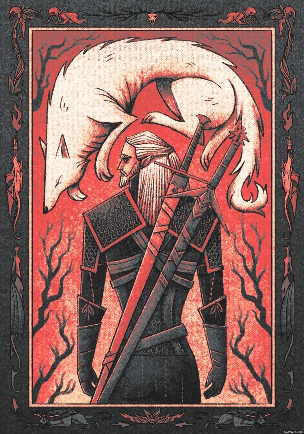 the video game "The Witcher 3: Wild Hunt," specifically Geralt of Rivia, a monster hunter known for his ability to track and slay various supernatural beings. He is shown with a wolf on his shoulder, which is one of the primary creatures he hunts in the game. The character is dressed in