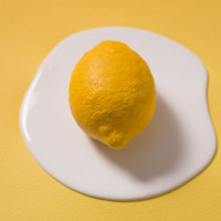 yellow substance, possibly a wax or similar protective layer. It is placed on a surface that has been painted bright yellow, and there seems to be an oily or sticky substance on the surface around the lemon, which could be part of the photography setup or a deliberate artistic choice.
