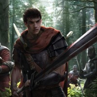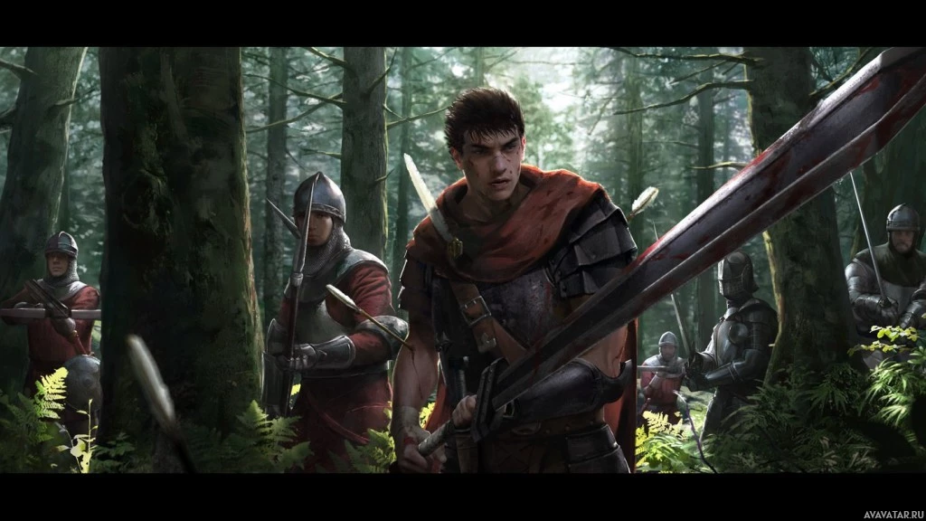 medieval armor, suggesting a historical or fantasy setting. They appear to be warriors or soldiers, possibly preparing for battle or a jousting competition. A man on the left is holding a sword, which is