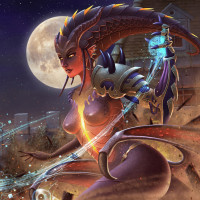 a humanoid form but with elements that suggest she might have non-human characteristics, such as pointed ears and slit pupils, which could indicate an elven or otherworldly heritage. The character is equipped with armor and holding what seems to be