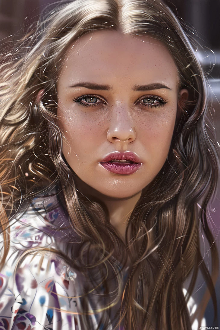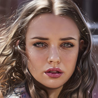 flowing hair and what appears to be makeup enhancing her eyes. She has