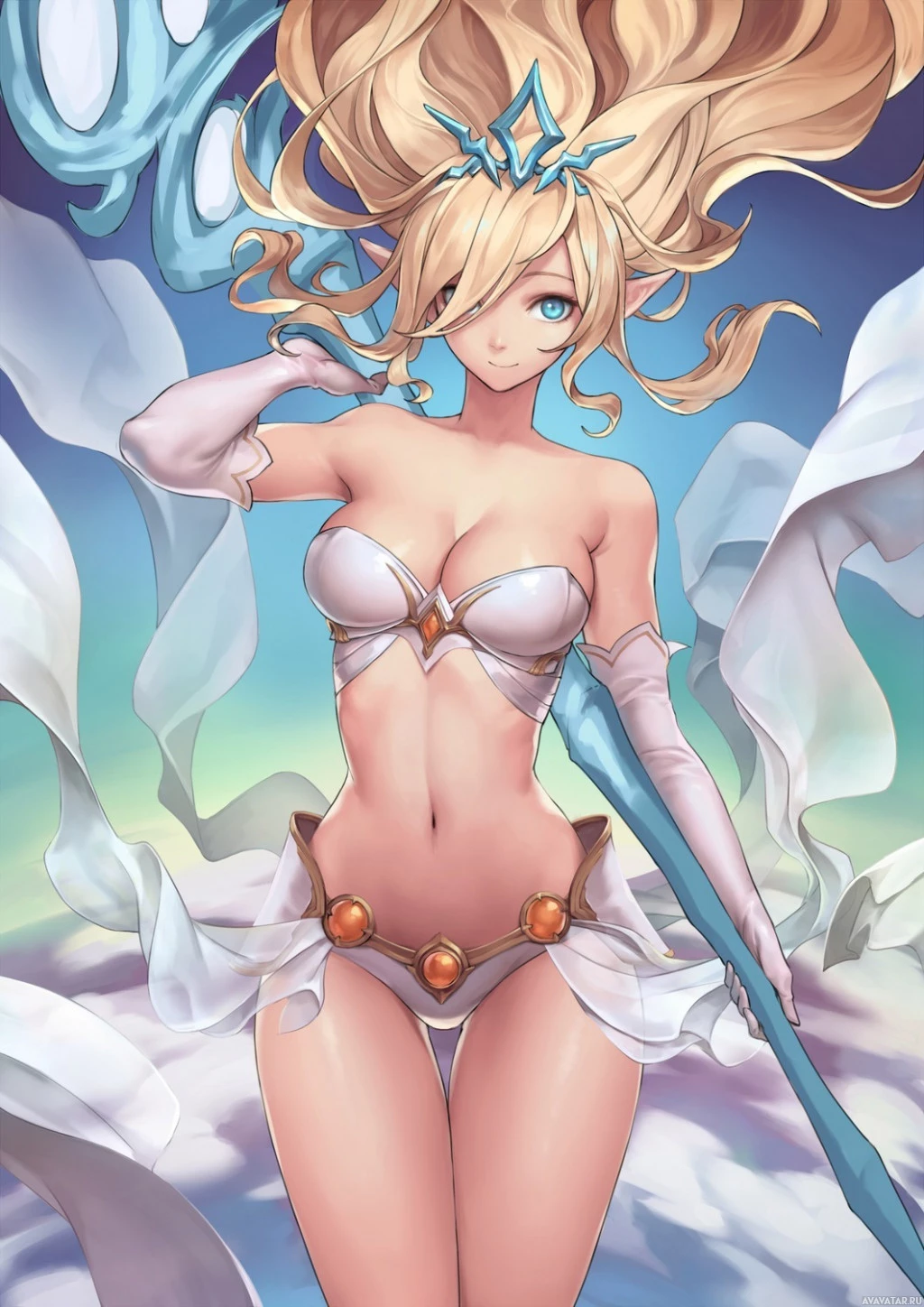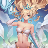 blonde hair, dressed in fantasy-style armor or attire. She has wings and is holding what looks like a staff or wand. The overall style of the artwork suggests it could be from a manga or anime series, known for their stylized illustrations.