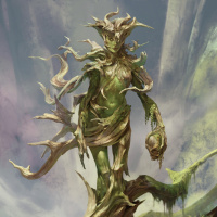a humanoid form but appears to be made of or fused with plant elements. It stands on the top of what looks like