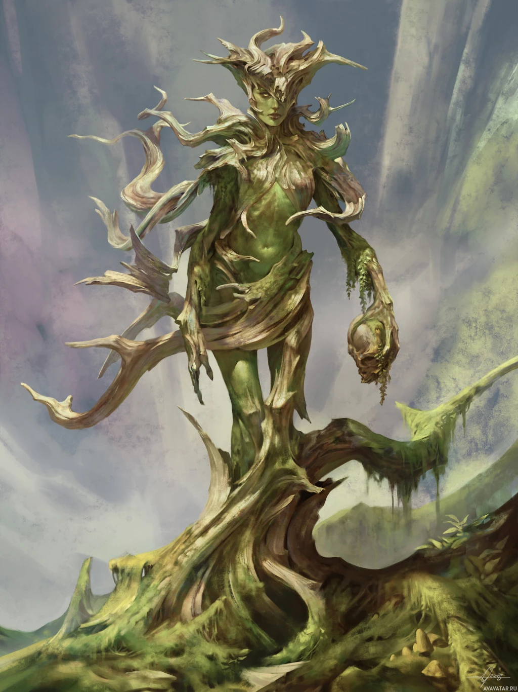 a fantastical creature resembling a dryad, which is often associated with tree spirits in mythology and folklore. This figure has