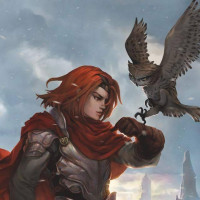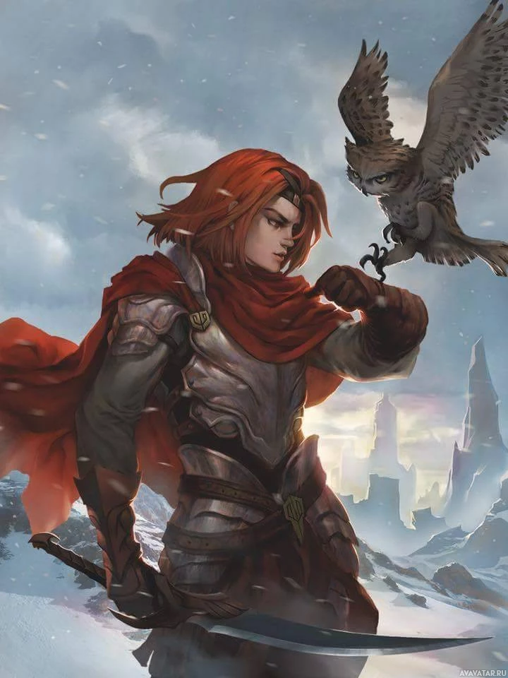 red hair and is wearing armor, indicating they might be a warrior or guardian of some sort. They are holding what seems to be an owl on their right hand, which could symbolize wisdom or companionship in the context of this