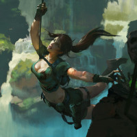 На этом изображении изображена женщина-персонаж, которая выглядит как Лара Крофт из серии видеоигр Tomb Raider. Она показана в середине прыжка на скалистом скалистом лице, окруженном растительностью и тем, что выглядит как плотная среда джунглей. Персонаж одет в зеленый наряд, который предполагает авантюрную обстановку, типичную для франшизы Лары Крофт.