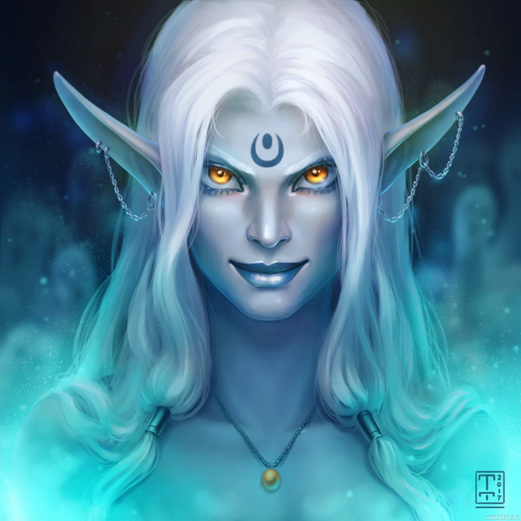 white hair and pointed ears, typical traits for drows in many fantasy stories. They are wearing accessories such as earrings and a necklace, and they have