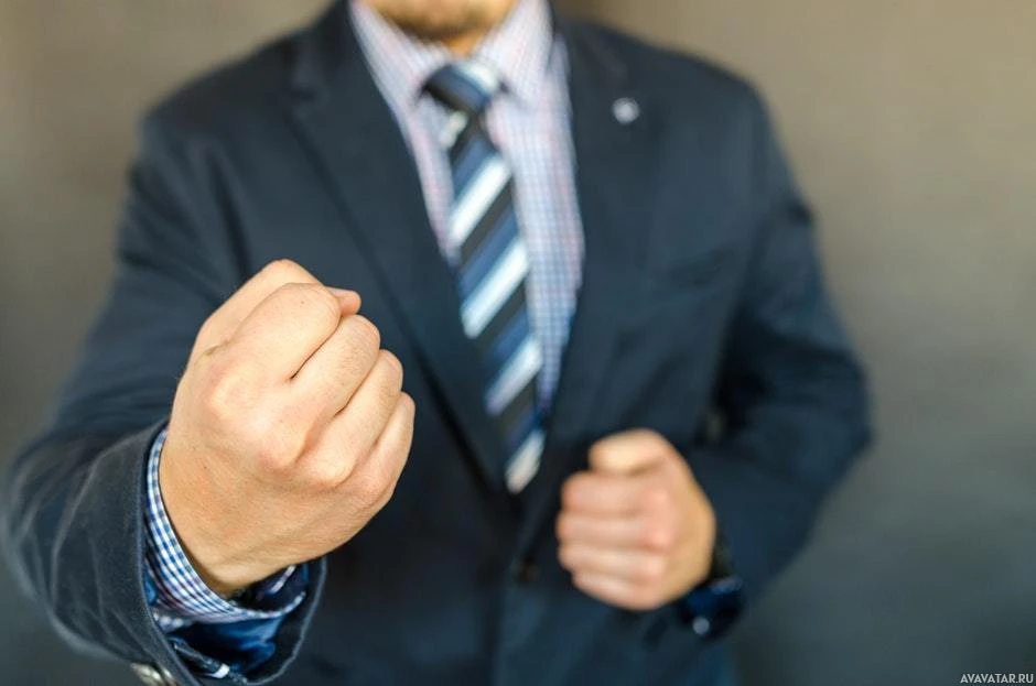 business attire, which includes a suit, tie, and shirt. He appears to be making a fist with his right hand, which is visible in the foreground of the photo. His left hand is near his chest, suggesting he may be gesturing or emphasizing something. The background is neutral, providing no additional context about the setting.