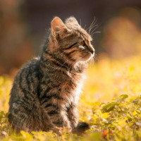 The image shows a young cat, also known as a kitten, sitting in what appears to be a field or meadow with yellowing vegetation, possibly during