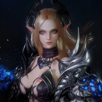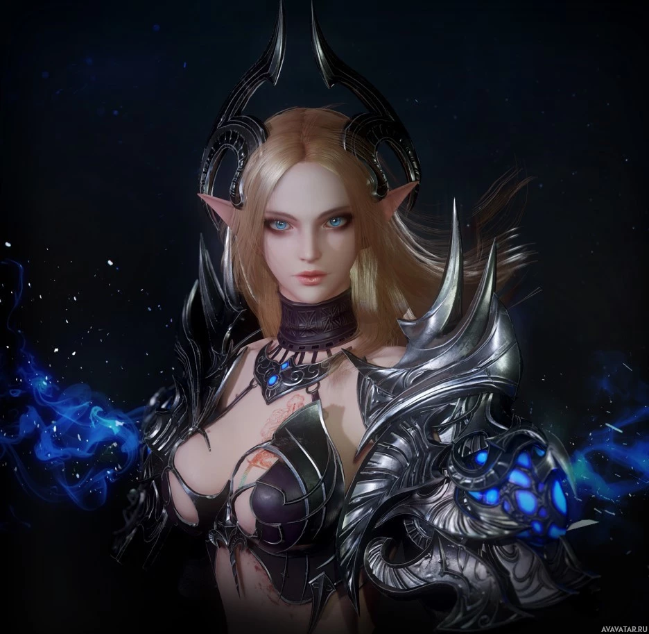a female character who appears to be an elf, dressed in armor with various fantasy elements. She has pointed ears and is wearing a helmet that seems to have a horn-like protrusion on top. The armor has