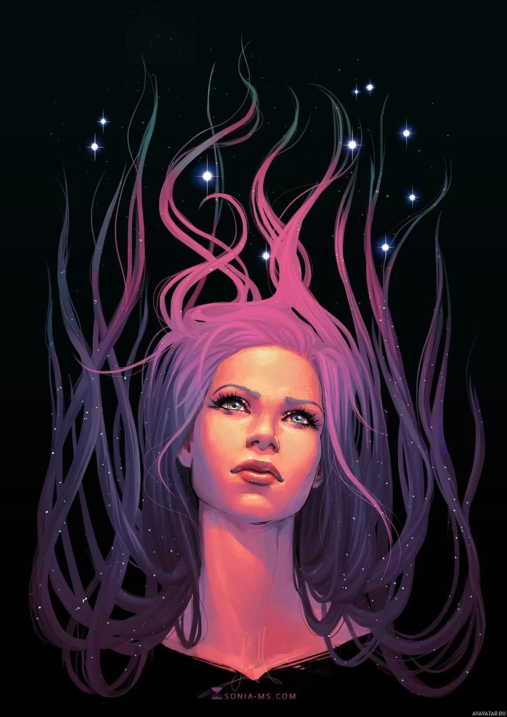 a sense of depth to the image. The overall tone is dark, with the background being mostly black and the colors in her hair and the stars contrasting brightly, drawing attention upwards. This artwork has an otherworldly or celestial theme, possibly suggesting themes of dreams, cosmos, or fantasy.