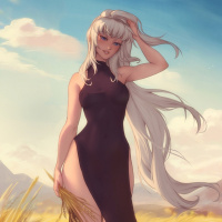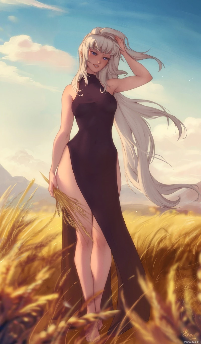 white hair wearing a black dress. She is standing in a field of wheat or grain, possibly suggesting a setting related to agriculture or