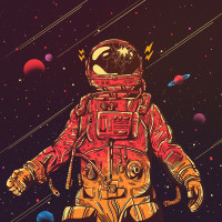 a backdrop of stars and planets, depicting a cosmic or space-themed setting. The astronaut is drawn in a stylized manner with exaggerated features, such as