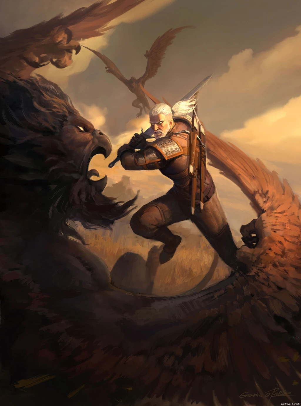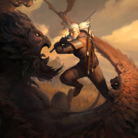 Geralt of Rivia, is shown in combat with two griffons. Geralt is dressed in his